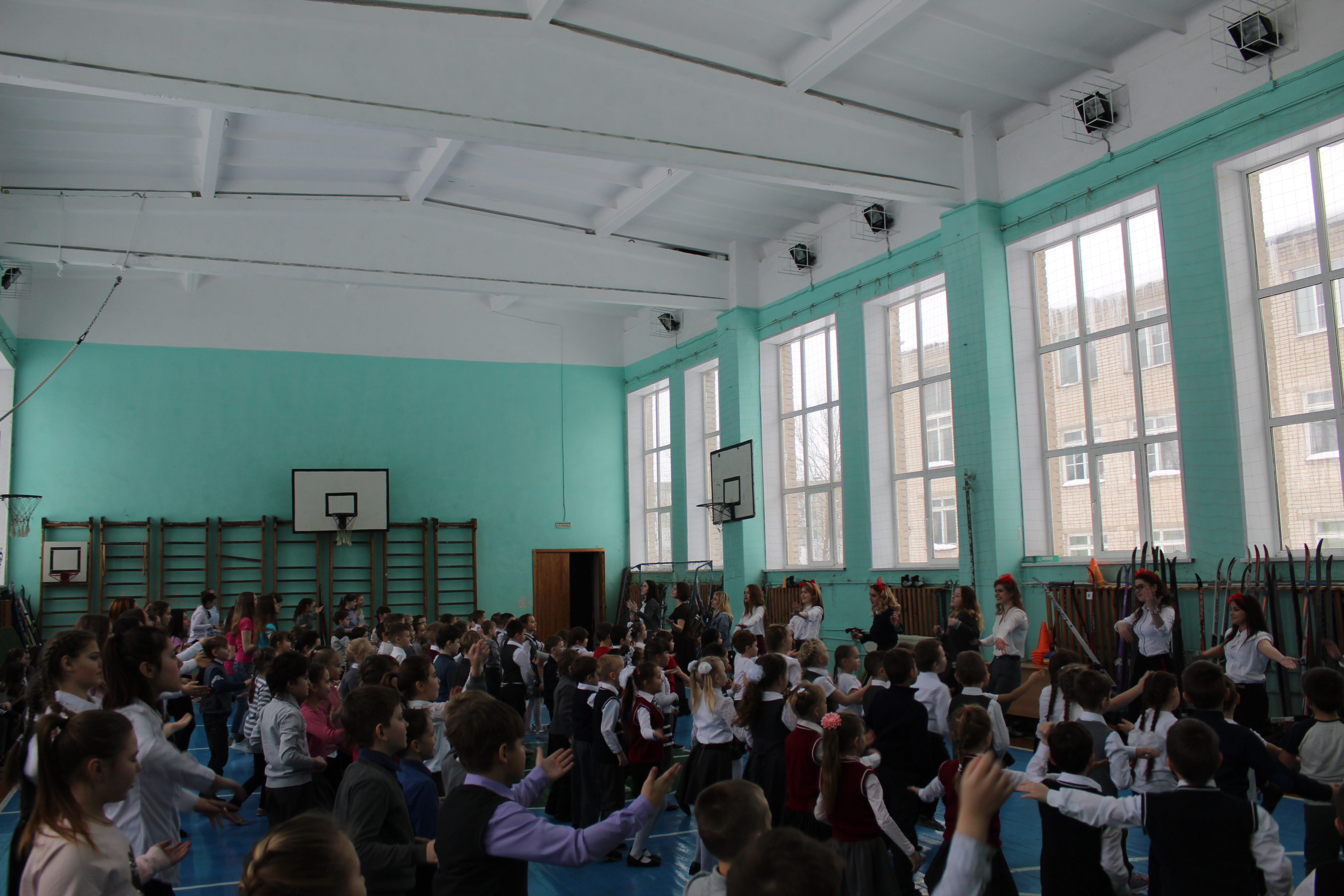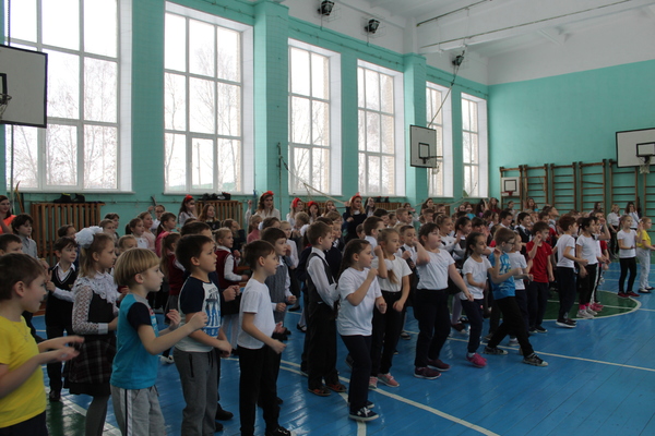 В этот день и уроки были необычными, все они были связаны со школой. А на перемене мы поучаствовали в поздравительном флешмобе в спортивном зале школы.