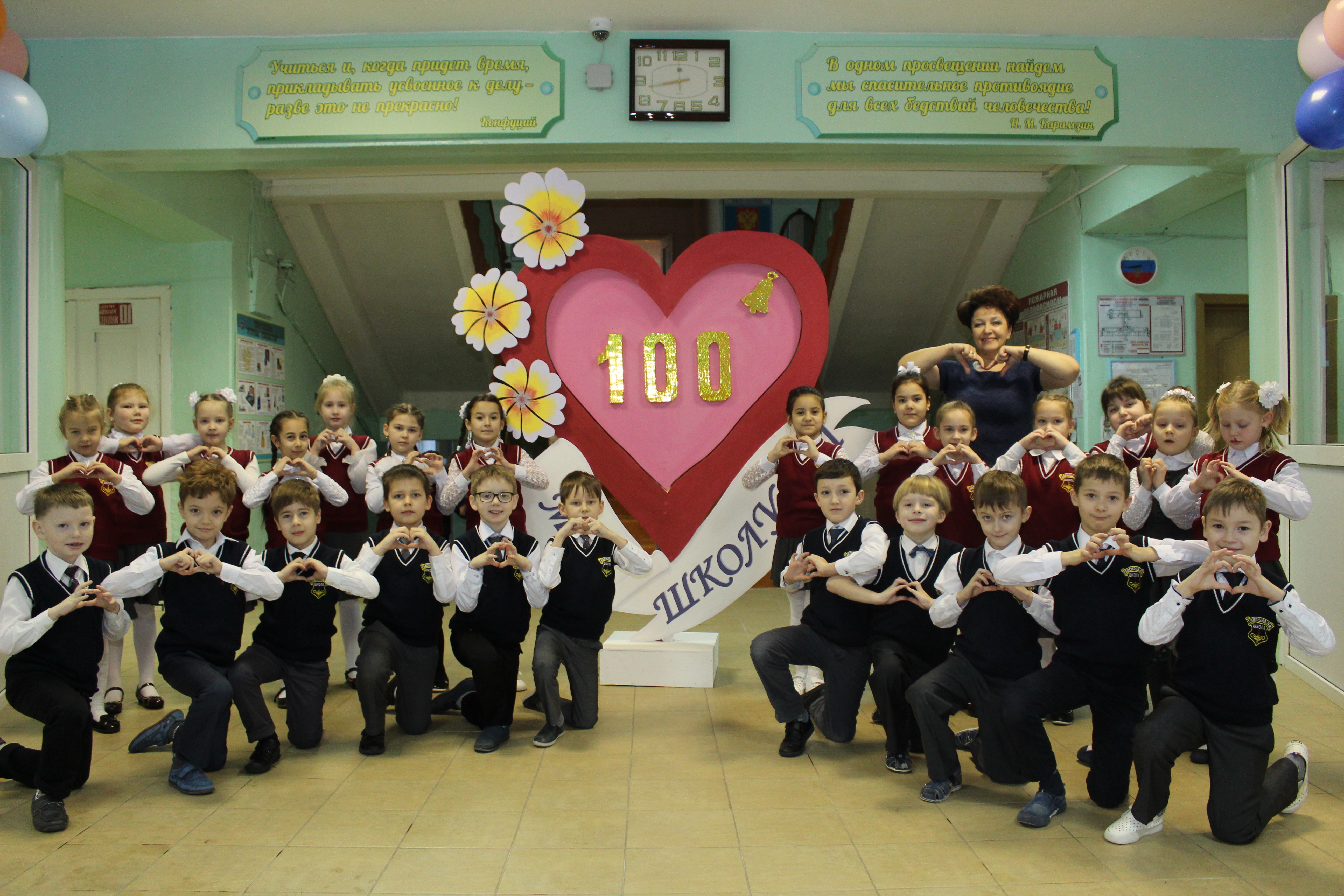 4 февраля, в понедельник, наша Средняя школа №1 начала готовиться к важному событию в ее истории - к столетнему юбилею. Школа в этот день была празднично украшена: на первом этаже появилось красивое сердце, а на стенах - калейдоскоп газет "Знакомьтесь: мы ученики Юбилейного года!".